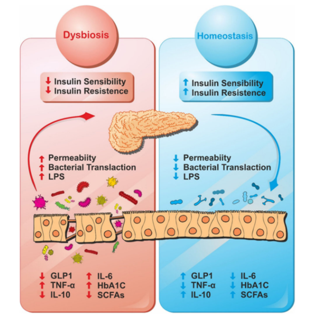 Figure 1: Gut microbiota in balance and bacterial disturbances due to diabetes.
